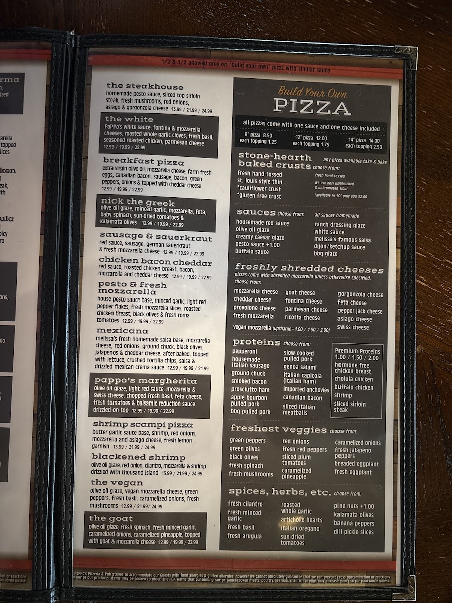 “ This is right next-door to the place where my wife gets her pedicures. I have never been here before, but she’s been in a couple of times and told me it was wonderful. I happened to be grabbing some supplies at the Ace Hardware nearby and saw Pappos was there and open for business. A large party had just exited and so I grabbed my umbrella after I parked my car and walked in the thunderstorm into the restaurant. At first, I thought it was pretty loud because of the concrete floor and the wooden tables, but as soon as the parents with the screaming baby left, it got much quieter. I was greeted at the bar by the general manager, Alex, who was covering one of her bartenders shifts tonight. She introduced herself immediately and asked my name. She was very kind and welcoming. I commented on the very impressive selection of beers they have. 32 taps on the wall and she is responsible for the selection. I can tell you, Alex has excellent taste! The beer list is voluminous and impressive. I don’t drink much beer any more, but I had two delicious ones. The house blonde ale is lovely. I didn’t have much room for a salad after a beer so I just went straight to an 8 inch pizza. My wife is currently out of the country and I didn’t want to have any leftovers and that was all I could eat. I nearly couldn’t finish that. I ordered a meat lovers pizza, and Alex was kind enough to swap out the bacon for mushrooms for me because I don’t enjoy bacon on pizzas, or much at all unless it’s cooked medium. Crispy bacon grosses me out. I think I’m a weirdo. At least that’s what my wife says about my bacon aversion. I got the hand tossed crust, and the pizza itself was very good! Probably top 5 in KC that I’ve had. Impressive for a chain, though I do not think there are any other locations in the metro. If you like pizza, you definitely need to give this place a shot. There were definitely some regular customers in there having a great time and we were all watching this sport called paddle ball on TV. Fascinating! Anyway, I will be headed back to Pappos for more pizza for sure and also at lunchtime for one of their tasty sandwiches. Five stars all the way! ”